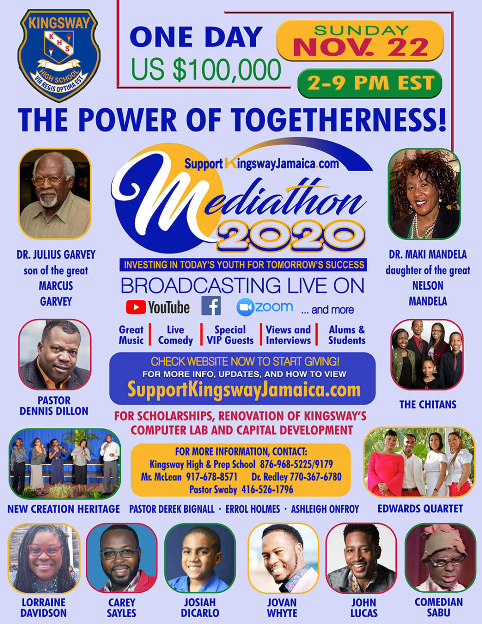 Kingsway is a private institution greatly impacted by the coronavirus and most parents are having great difficulties paying their children’s tuition. The school is also in dire need of technology upgrades to facilitate remote learning. It is for this reason that hundreds of alumni, teachers, and friends of Kingsway and Kingsway’s alumni are organizing a special fundraising mediathon – scheduled for Sunday, November 22 from 2pm to 9pm – to support the school, students, and the children of Jamaica.